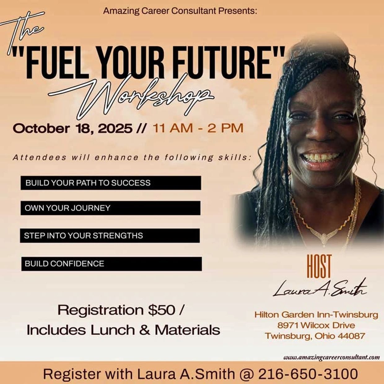 The Fuel Your Future Workshop will be held on October 18, 2025, at the Hilton Garden Inn in Twinsburg, Ohio. This event is designed to help participants build their path to success, own their journey, step into their strengths, and build confidence. Registration is $50 and includes lunch.